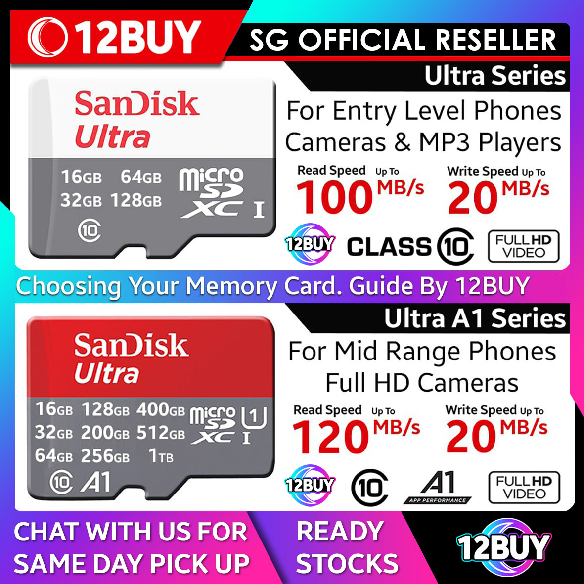 SanDisk Ultra microSDXC Card Full HD 1080 U1 UHS-I C10 120MB/s 32GB 140MB/s 64GB 128GB 150MB/s 200GB 256GB 400GB 512GB 1TB QUA4 QUAB QUAC 12BUY