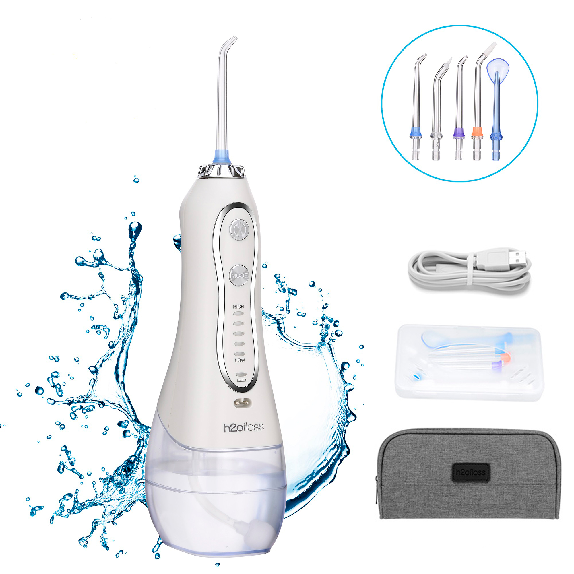 H2ofloss Portable Oral Dental Irrigator Cordless Wate Flosser Waterproof Teeth Cleaner with 5 Modes 5 Jets Tips and 300ml Detachable Reservoir Rechargeable Dental Flosser for Brace Bridges Care, Home Travel