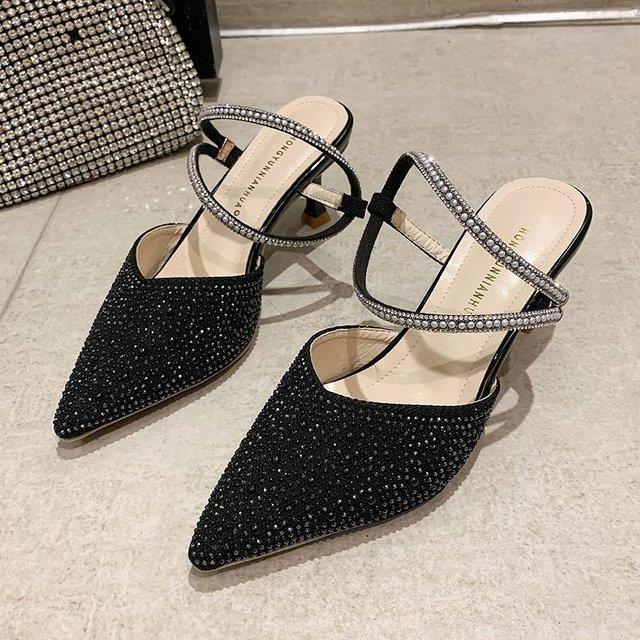 Closed Toe Sandals for Women 2021 Summer New Rhinestone Pointed Toe Two Way Elegant Lady Stiletto Sandals High Heels