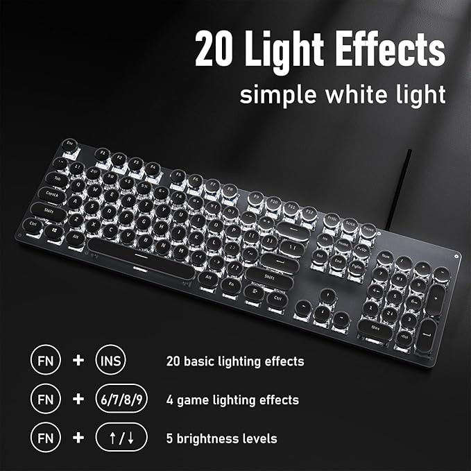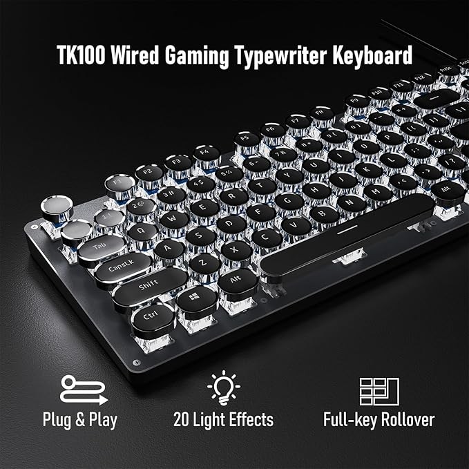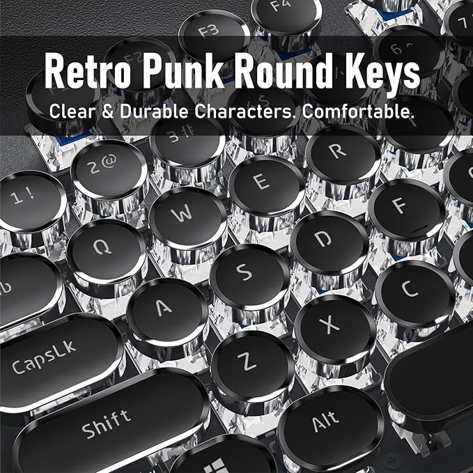 • Retro Typewriter Style Round Keycaps: The TK100 wired typewriter keyboard uses a double-shot injection retro punk round keycap with a clear backlight, which is extremely durable. Stepped floating keycaps that fit your fingertips perfectly, a precise position. Ergonomic foot support makes typing less tiring and more comfortable. The highly durable mechanical blue switch responds faster and more quickly, accompanied by a crisp click