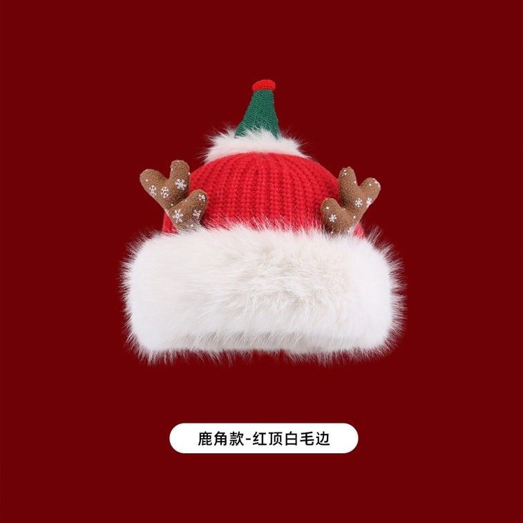 New Cute Christmas Warm And Thick Ear Protection Furry Woolen Hat Antlers Style - Red Top With White Fur Edge F